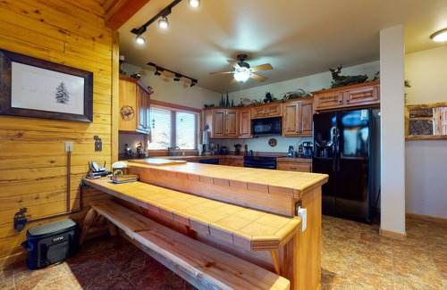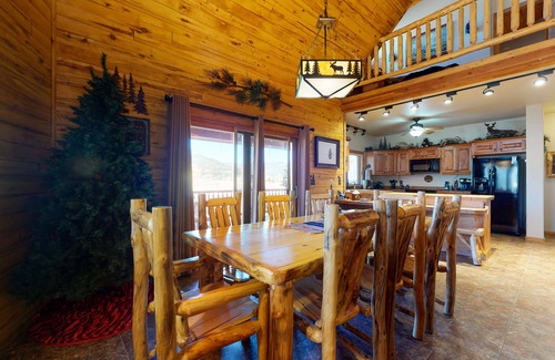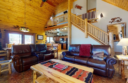 Right on the banks of the South Fork of the Rio Grande, this custom log cabin home is big, rustic, and perfect for your family's next vacation to South Fork! This home is tucked into an aspen grove and features an outdoor firepit, three bedrooms with king-size beds and en-suite baths, and a private loft area. Spread out in the living room to watch a good family-friendly movie on the mounted flatscreen TV or to read a favorite book to the kids. You'll love preparing delicious meals in the full kitchen, and the dining table has enough seating for up to eight guests. Take the chill off autumn months with the wood-burning fireplace and the private hot tub. You'll have great river views right from the deck, which your guests will love while they enjoy an al-fresco meal.