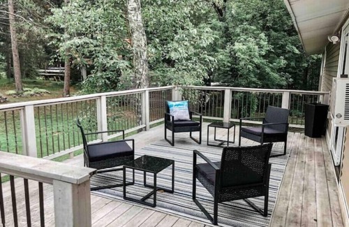 Upstairs- Open kitchen with new appliances, dining room, living room with pull out sofa bed, deck, king bedroom, queen bedroom and full bathroom