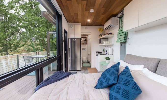 Please note: You're staying in a tiny cabin, which means things are a bit more compact—including the bed! It may not be your standard mattress or frame, but it's cozy, thoughtfully designed for the space, and many guests find it perfectly comfortable for a restful night in the woods.