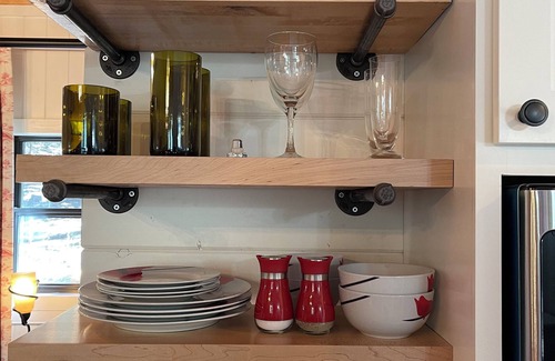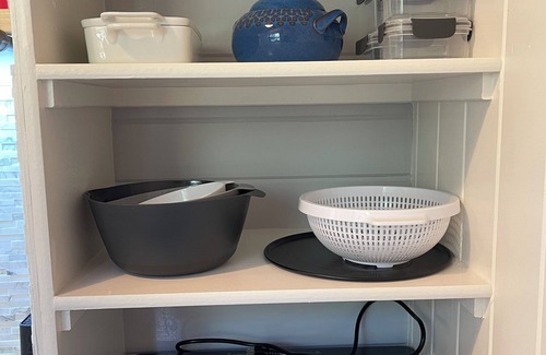The kitchen is open plan, with a small fridge, with an ice box, two ring hot plate, multi-function toaster oven, microwave, K-cup coffee maker, milk frother, tea kettle and all the pots, plans and utensils you will need. A small dinning table completes the kitchen nook.