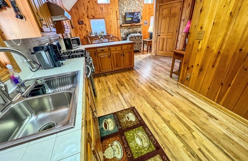 The main level features an open concept floor plan with vaulted ceilings. The living area features a comfy leather sofa and two recliners. a smart TV, and a floor-to-ceiling stone fireplace with gas logs. You will love curling up to watch your favorite show or movie. Wi-Fi is provided throughout the home for those that need to check email or just connect with social media.