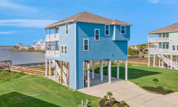 Breathtaking sunrises, tranquil bay views, and unforgettable Texas Gulf Coast memories are waiting for you at Deja Blue. Located in one of Galveston’s premier West End communities, this sprawling stilt home has room for the whole gang— and then some. With 4 bedrooms, 2 living areas, 2 covered decks, a game room, a barbeque patio, a short drive to the beach, and private access to the best fishing pier in the area, your family will love to spend a little time at Deja Blue.