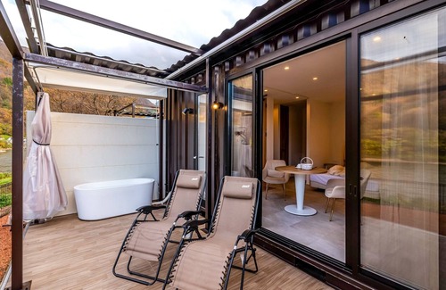 The units crafted from shipping containers offer an ecofriendly blend of modern aesthetics and nature With private saunas select units and panoramic river views RMOGAMI provides an everchanging canvas for seasonal beauty Guests enjoy minimal staff interaction immersing themselves in the tranquility of this unique escape / The Type B room is best designed for couples or parties of 2