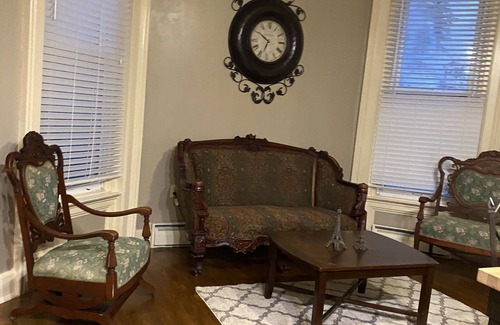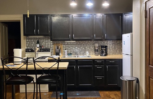 Enjoy walking the neighborhood and admiring all the old buildings of from St. Jo’s golden Era. This is a first-floor, private unit in a beautiful restored historic building. There is a full kitchen, grand queen bed, and large screen TV.