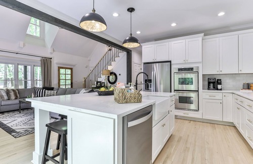 This exquisite cabin features a plethora of amenities designed to enhance your experience. The open-concept kitchen showcases stunning white shaker-style cabinets, elegant countertops, and state-of-the-art stainless steel appliances, perfect for preparing meals with family and friends. Gather around the spacious island or enjoy evening conversations around the cozy wood-burning fireplace in the main living area. The outdoor decks provide additional entertaining space, complete with a firepit and comfortable seating, inviting you to create lasting memories while soaking in the serene wooded views. With four elegantly designed bedrooms and updated bathrooms, each guest will enjoy luxury and privacy during their stay.