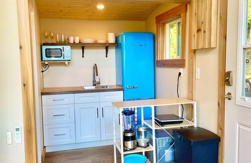 The fully outfitted kitchenette features a full sized retro fridge and microwave, infrared burner, convection oven (It does it all - rotisserie, air fryer, toaster, dehydrator etc.), blender, 2 coffee makers, (french press and drip), kettle and everything else you need for cooking.