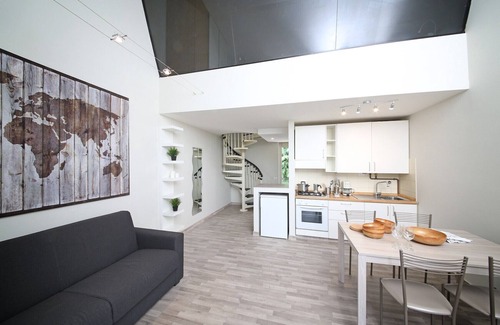 The apartment consists of a large bedroom with double bed on the gallery, a living room with double sofa bed, dinette and kitchen, two balconies and a cellar as a shelter for bicycles is also available.
