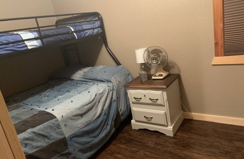Bedrooms each have a queen / twin bunk bed (see pictures). Air conditioning, new TV, two large recliners, and table / chairs.
