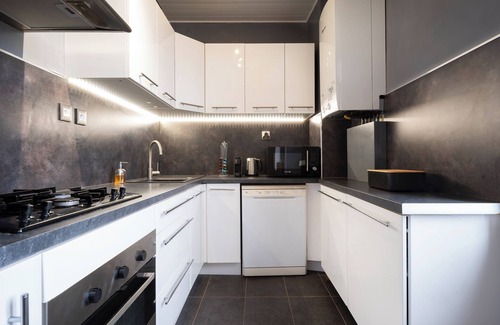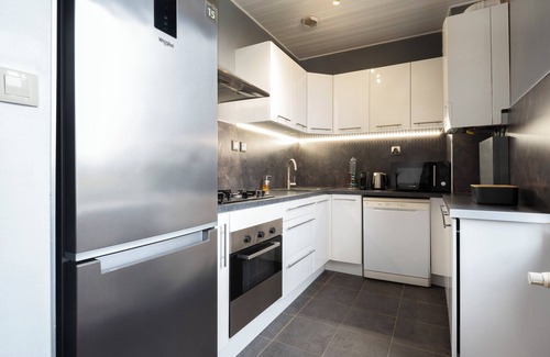The apartment features a bedroom with a double bed, a sofa bed in the living room, a spacious lounge, a fully equipped kitchen, and a modern bathroom. For added convenience, you’ll have a washing machine and dishwasher, making it perfect for longer stays.