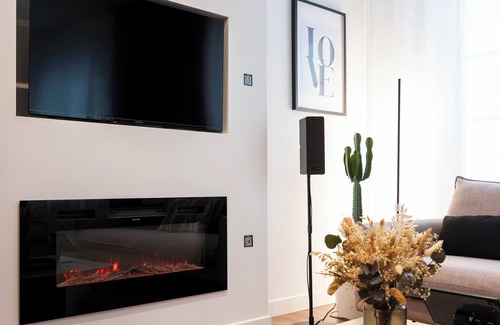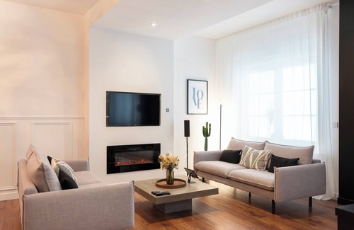 A spacious and refined living room, featuring modern and elegant decor, perfect for relaxation or indulging in your desires. An electric fireplace adds a warm and intimate touch, creating a cozy ambiance for relaxation or special moments.