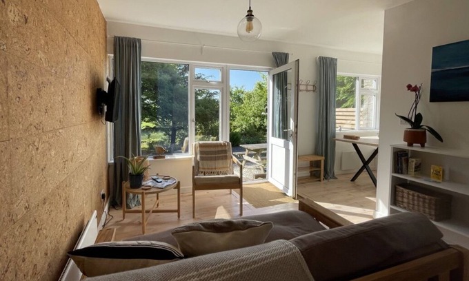 A spacious double bedroom provides a calm and peaceful sanctuary with soft French linen or high quality cotton bedding, a green vista of natural planting and a Devon hedge. Sleep soundly and wake up to birdsong.