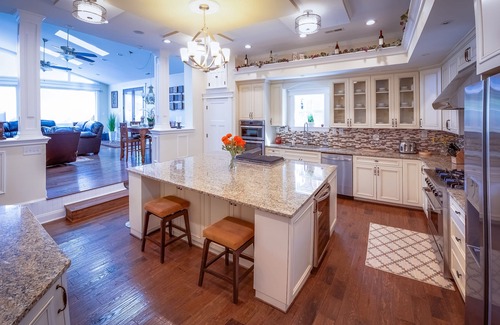 Gourmet Kitchen: The main level features a state-of-the-art gourmet kitchen equipped with top-of-the-line appliances and an oversized granite island, creating the perfect space for catering or meal prep before the big event.