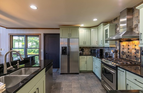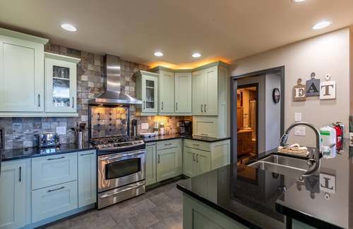 As you enter the main level, the stone fountain set into the wall greets you with soothing water ambient noises. The kitchen, fully equipped with all the cooking items you will need, has a stone flooring and beautifully detailed stone tilework on the walls around the granite countertops and stainless steel appliances. The elegant solid wood dining table with four chairs and a bench plus four extra stools as well as three stools at the kitchen bar provide plenty of dining space. Access to the attached garage is through the kitchen, and the 2-bay garage has one bay for guest parking and one set up with a ping-pong table.
