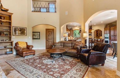 You'll find a regal manor house-feel to the Summit House, both inside and out. There's a huge covered patio in the back, replete with comfortable outdoor furniture and a gas grill. Have a chat around the two fire pits, or savor a dip in the pool and hot tub. Beautiful Hill Country views and bountiful wildlife surround the house, and you can fish and kayak on the creek-kayaks are even provided! The depth of the creek here is seasonal, so please check on this detail when you book with us. Smoking is allowed, but outside only. Covered parking is available for your vehicles, too.