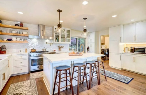 Stunningly beautiful and charming house! Recently remodeled Full cooks kitchen with double oven, wine cooler, coffee service area, full dining room with table extenders and additional seating. Living room with 75" TV plus full cable services (Peacock, Netflix, Paramount+, Disney, Max), plus huge selection of DVDs. Patio in back for BBQ and entertaining or quite time.