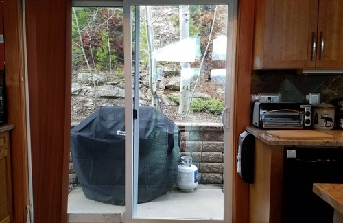 -sliding patio doors in kitchen open to cozy back patio with stainless gas grill