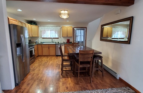 Downstairs has a master bedroom and bathroom with a roomy walk in shower, a removable shower head and heat lamp. The laundry room includes a washer & dryer. The kitchen has an open concept with a large dining room table perfect for gathering for meals or playing games.