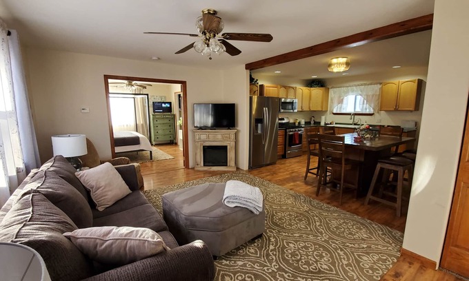 The upstairs has two bedrooms, a bathroom with a tub/shower combination with a removable shower head. A cozy living room with a 55" smart TV. We also have an area with a work desk that can also be used as vanity to do your makeup and includes a magnified lighted mirror.