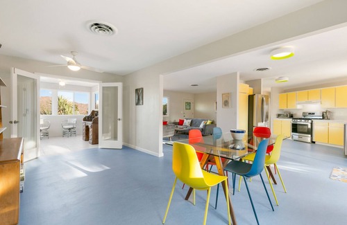 Rocky Ridge Retreat is a cozy, colorful place to call home during your Joshua Tree getaway. Minutes walk from fantastic desert hikes and minutes drive from Downtown Joshua Tree and the National Park entrance. Enjoy a soak in the hot tub after a long day of exploring and a great view of the beautiful starry skies from the backyard fire