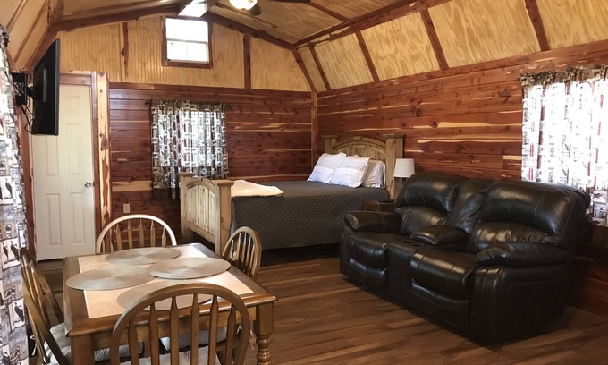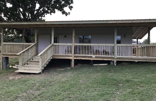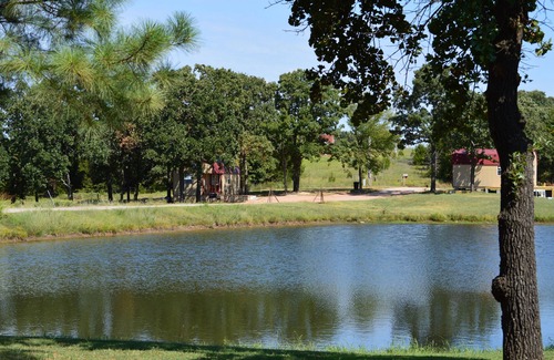 Beautiful rustic cedar cabin with large porch and within walking distance of the winery. This cabin is at the end of the road in a seclude location with a large fishing pond and plenty of nature. Each cabin has a private fire pit and charcoal grill so you can set out by the fire in the evenings and enjoy the view of the vineyard or a beautiful Oklahoma sunset. Each cabin has a kitchen and is fully equipped with everything you need and all linens are furnished.