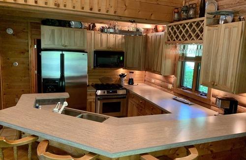 The Guest Cabin has 4 beds (sleeping up to 8 people) and three bathrooms. Main level has a master bedroom (King Size Bed) with an on-suite bathroom, laundry room, kitchen, and living/dining area. Upstairs is a loft (Queen Size Bed) with an on-suite bathroom, and lower garden with two queen beds with an on-suite bathroom as well. All bathrooms are stocked with towels for your stay. The kitchen is fully stocked with dishes, utensils, coffee maker, microwave, oven, refrigerator, and dishwasher. Rocky Waters Fisherman’s Cabin is located not far from Elizabeth and approximately 18 miles from Historic Downtown Galena IL.