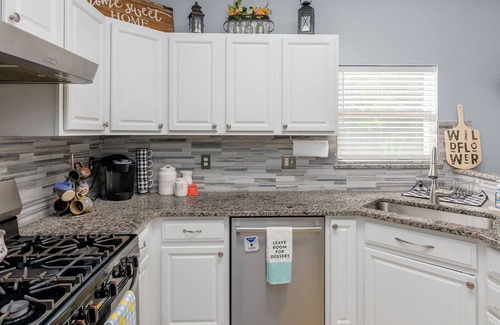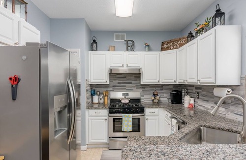 As you walk in the front door of our quaint home you're greeted with a refreshing view of the living room and open concept dining area. The living room has a large smart tv for streaming your favorite shows and plenty of seating space on the large leather sectional. As you turn the corner you'll see the well equipped kitchen with all you could need for your cooking and baking needs. The kitchen is well lit and very spacious with plenty of storage and a dedicated pantry as well. Adjacent to the kitchen is the dining room of which has a beautiful sliding glass door that steps out onto the deck overlooking a quiet grove of trees and fenced back yard. Down the hall from the kitchen are bedrooms 2 & 3 and a hallway full bathroom for them to share. Bedroom 2 has a queen size bed & large smart tv. Bedroom 3 has a trundle bed that pulls out to be 2 twin beds. You'll also find a dedicated work space in bedroom 3 with a desk, cushioned chair and lamp. On the other side of the house you'll find the master suite which has a large king size bed with plenty of cozy pillows and an ensuite full bathroom with dual sinks. The master suite also has a large smart tv for streaming and a large walk in closet which is where you'll find the pack-n-play and high chair if you need them for the little ones.