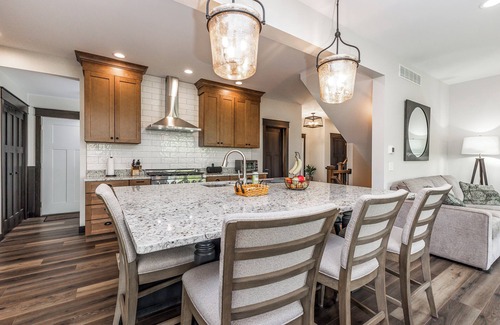 This six-bedroom home can fit everyone comfortably with one king bed, ten queen beds, and a daybed. Each bedroom has its own private bathroom, making it perfect for six couples to have their own space or twelve golfers to have their own bed. Gather in the great room with a fireplace, massive breakfast bar, and a twelve-person dining table ideal for sharing meals and stories.