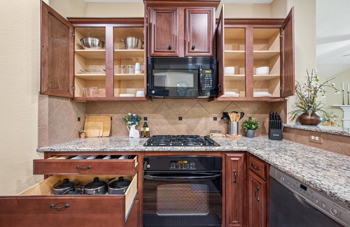 Cook with ease in the fully stocked kitchen, featuring granite countertops, generous cabinet space, and small appliances including a blender, toaster, kettle, and Instant Pot.