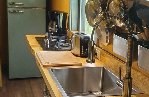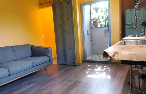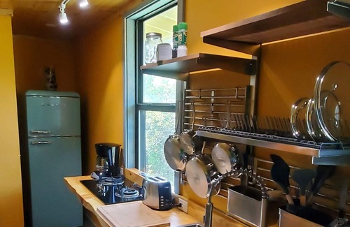 Enjoy a rejuvenating getaway. Beautiful local wood featured throughout-Kitchen, Bathroom, & Dining/Workspace countertops. A very inviting two person shower w a Lush Garden Plant window trimmed w 100 year old reclaimed Redwood & river stone floor. Large cushy sofa to lounge & relax on. Meandering twelve minute drive to downtown Eureka Springs or seven minute drive to 43,000 acre Table Rock Lake. Bring all the gear you want; we are centered in what Northwest Arkansas is world famous for.