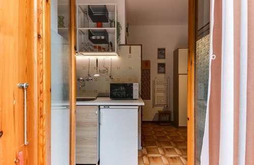 Living room with double bed, kitchenette and private bathroom with shower, equipped with independent heating, digital TV, Wi-Fi connection, bathroom and private balcony overlooking the mountain. This holiday flat is located on the second floor of the residence. You will find a finely furnished and equipped room with everything you need: the kitchen is equipped with a refrigerator, 2 burner induction hob, microwave oven, coffee maker, dishes and crockery, bed linen and towels, hairdryer, washing machine, iron and ironing board.