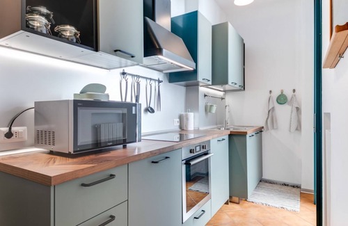 La cucina è completamente attrezzata e dispone di piano cottura a induzione, microonde, forno, bollitore e lavastoviglie.
