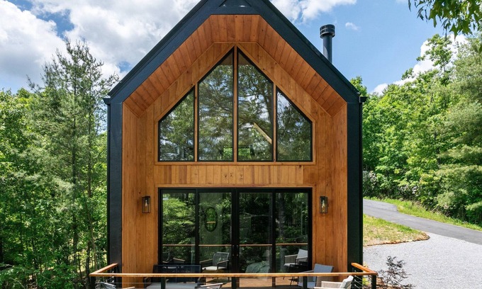 Romance meets design at Viking Hut, a Scandinavian 1BR retreat in the North Georgia mountains. Floor-to-ceiling windows frame fiery fall leaves, a skylight invites stargazing from your king bed, and a fenced yard makes it perfect for pups. | Cabin in Young Harris