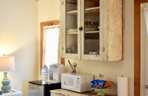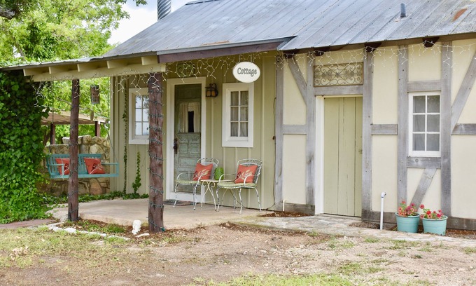 Your stay at the Romantic Ava Haus Cottage features a variety of amenities tailored for comfort and relaxation. The spacious interiors include a king-size bed, a roomy bath with a claw-foot tub and shower, and high-pitched ceilings that enhance the cozy ambiance. A fully stocked kitchenette ensures that you have everything you need to start your day, while board games and BBQ grills invite leisurely evenings spent with family and friends. Additionally, enjoy the porch swing that beckons you to unwind amid the beautiful Texas landscape. Our accommodations are pet-friendly, so your furry companions can be part of your special occasion too!