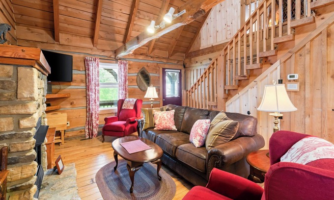• Space: Intimate 2-bedroom log cabin with elevated furnishings (Master suite on main level with king bed! Cozy loft retreat upstairs)