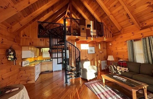 Intimate Cabin to get away from it all, but with all the comforts of home. Queen Loft Bedroom, Full kitchen, 2 bathrooms (1 on lower level, 1 on basement heated/cooled) Full size Washer Dryer. Pull out sofa bed Queen)