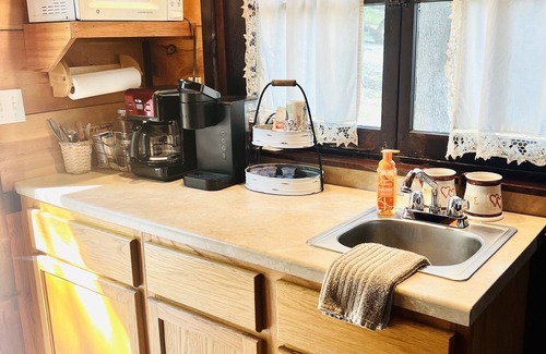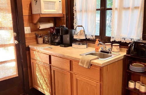 Step inside to discover a blend of elegance and coziness, featuring original hardwood floors, a stone fireplace, and quaint dining furniture. The oversized jetted tub with an overhead rain shower invites you to relax and unwind after a day of exploring. Enjoy the comfort of a king-size bed and well-appointed kitchenette, ensuring you have everything you need for a pampered stay. Whether you're making new memories or reminiscing about past ones, this charming cabin provides the perfect backdrop for love and connection.