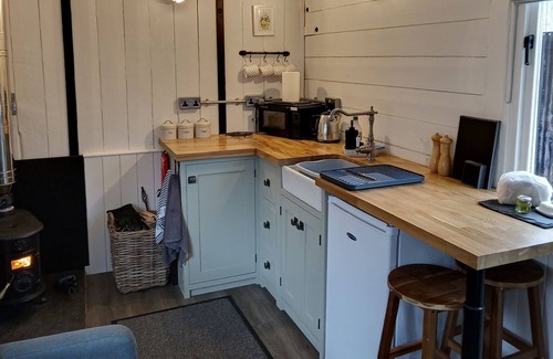 The carriage has a compact kitchen with everything you need as well as a full size fridge to keep the wine and bubbly chilled ready for the hot tub. A welcome pack awaits your arrival. A log burner to keep you cosy on chilly nights or an electric heater if you prefer.