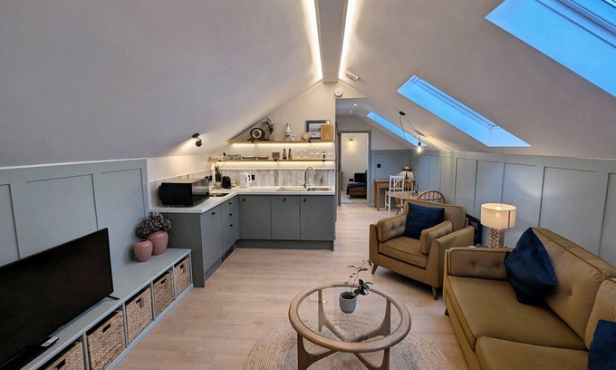 Bright and airy, the living area includes a dining table, seating area and kitchen. The modern kitchen includes a dishwasher, fridge (with a small freezer compartment), a combination microwave, hob, toaster, kettle and Nespresso coffee machine, as well as all the essentials you need.