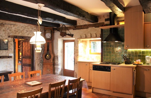 * a charming kitchen where time seems to have stood still (with the exception of the modern equipment!): stone walls and exposed beams, traditional cantou fireplace, solid farmhouse table and chairs, romantic decoration...