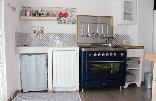 The house is on two levels with a large living room with open kitchen of high standard: ILVE oven with 4 burners and fish in the center; large fridge column, hidden in a cute wardrobe, antique marble sink, antique tiles, and so on.
