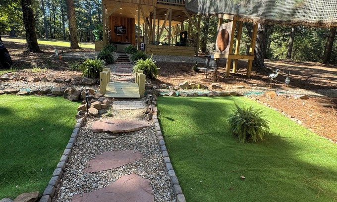 Upscale treehouse for couples to relax and enjoy peace and quiet on 5 private acres. You will have the entire place go yourself. Owners do live on the attached 5 acres but will not interact unless you need something. Floor to ceiling windows gives the perfect view of the lighted pond with fountain. Enjoy the sound of the water while making s’mores at the fire pit with your special someone. The hot tub on the patio underneath is the perfect place to relax and watch tv. The patio also has a gas grill, seating area and dining space along with tons of games including cornhole, ping pong, badminton also a classic camper featuring a retro arcade!!. Slip into the robes provided and head back upstairs for some popcorn and a movie before falling into super soft bamboo bedding and extra cozy mattress.