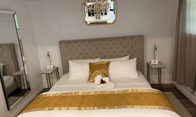 A king size bed is waiting for you with a chandelier to set the mood. Luxurious bedding and towels included.