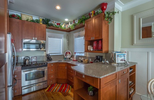 Yore upscale galley has everything you need! Granite countertops, stainless appliances, oven, stove, dishwasher, ice maker, coffee maker, microwave, toaster oven, blender, sinkerator. If ye come prepared to cook yore own grub, it's full stocked. Pots, pans, crock pot, cooking utensils, dishes, silverware, oil, seasonings etc.
