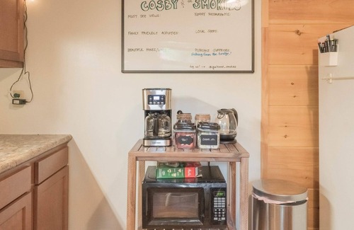 The kitchen is open to the living room and is small but mighty! We provide pretty much everything you need to cook and a coffee/hot chocolate bar (check the amenity list!)