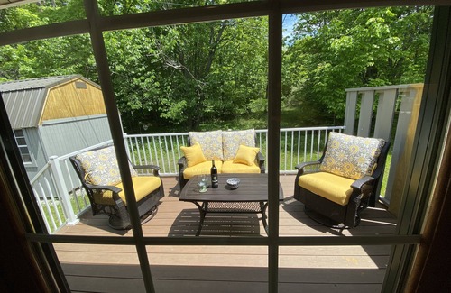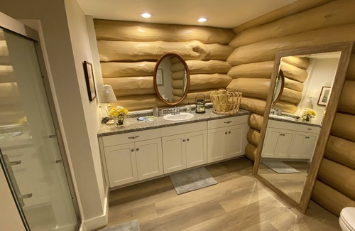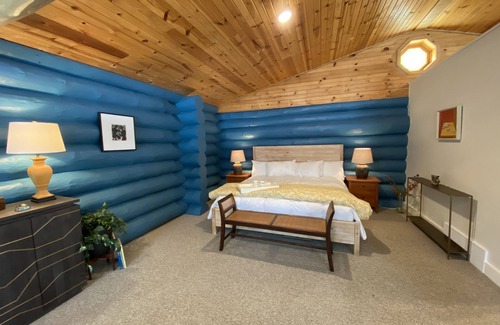 A brand-new renovation transformed this log home into an artistic, luxurious and beautiful hideaway, featuring a single very large open-plan space with cathedral ceiling,. There is a full kitchen with dining area, inviting gas fireplace-and-surround with large-screen Roku TV (with cable, Netflix, Hulu, HBO etc), ample and comfortable seating, and a King-sized bed with luxury linens. Modern creature comforts include remote-controlled fireplace, ceiling fan, electronically controlled heating and AC, and subtle lighting to help create memorable evenings. This romantic and fun space feels at once totally private, and elegantly spacious. An eclectic mix of furnishings and art-work throughout complements the rich colors of the log-beamed home, colors which were chosen to reflect the Nordic heritage of the local area. A large bathroom with a walk-in shower complements the main space. Through French doors you can pass from the kitchen area onto a 15' x 9' external deck that looks out towards the neighboring woods - ideal for sitting outside for breakfast looking for deer, or on restful Door County evenings. Three other large picture windows look out to the newly created raised rock-gardens, planted with flowering trees, native perennials and literally thousands of spring bulbs. While my primary aim was to create the ultimate romantic experience for a couple, the queen sofa bed can provide sleeping for two extra guests (suitable for children for instance)...although it should be understood that although the whole place is large and spacious, there are not separate bedrooms. I wanted to create a place where guests can really spread out and enjoy the feeling of freedom and space, not only while outdoors exploring Door County, but indoors too. N.B. As this is the very first season that the house has been available for rent there are no reviews (yet!). However, my two well-established vacation rentals nearby, also on the "Green Gables" property, have been give almost entirely 5-star ratings by more than 100 groups of guests. Please check out the PLUM RETREAT, which sleeps up to 6, and BIRCH REREAT which sleeps 2-4. There is also a SECOND brand NEW vacation home at Green Gables this year: the APPLE RETREAT, a beautiful, light-filled and spacious home with full kitchen, sleeping 2-4, great for small families or 1 or 2 couples. Please explore these to read the many reviews with guests' positive feedback: