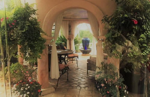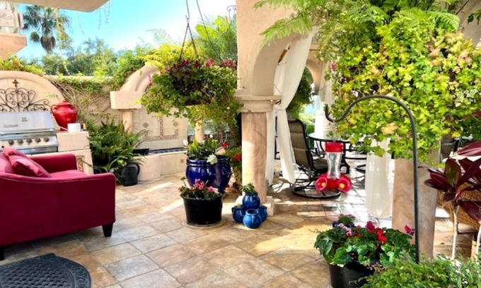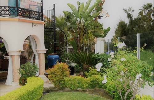 This home is a beautiful 2 bedroom/2.5 bath, 1,800 sf on the rim of a coastal canyon. When you look up the canyon, you see the mountains. When you look straight ahead you see all the beautiful homes in the canyon below you. The lights at night are spectacular. The view spans more than 250°. It is very Zen and peaceful with beautiful flowers and fountains, an enchanting piazza for a open-air brunch or dinner.