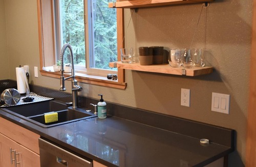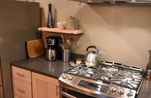 Designed as a romantic getaway, the house also has a comfortable queen sofa / bed in the living room in front of the fireplace. There is a bathroom off the kitchen on the main floor and a master bath off the cozy loft bedroom. The fully equipped gourmet kitchen is stocked with everything you'll need to complete your delicious creations.