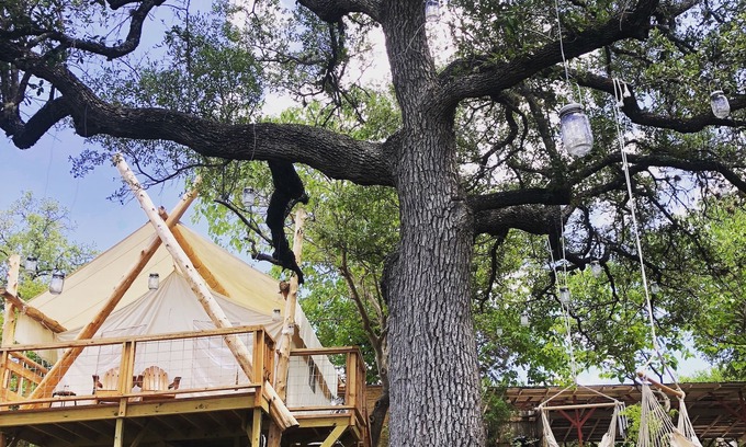 - Treehouse Style Yurt near Austin, Hot Tub, FirePit, Outside Shower
