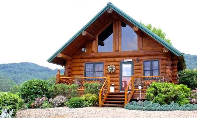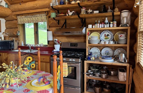 This alluring cabin and our larger cabin 'Country Haven' are situated on 1 1/2 acres privately owned land nestled on a knoll among rolling hills with majestic mountains in the background. As you relax on the rocking chair porch you will enjoy the scenic views along with the country sounds of chickens, cows ,horses, and wild turkeys on the neighboring land.