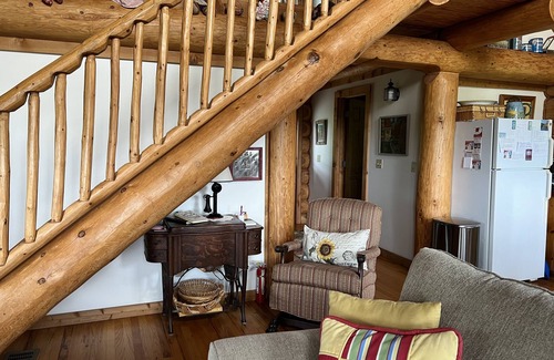 This magical retreat is an authentic log cabin with beautiful antiques and many articles handcrafted with love by Carl. Family paintings and treasures are scattered throughout the cabin. Guests say it reminds them of being in Switzerland- they are close since Germany is my birthplace. Our cabin boasts red oak hardwood floors throughout, huge windows with beautiful views from the loft. The 'old time' look of the The kitchen has a gas stove/convection oven, there are plenty of dishes, pots and pans to make any cook happy.. The bathroom with shower is well supplied with plush towels, soaps, shampoo, conditioners, hairdryer, and starter supply of paper products. Both the full size bed in the downstairs bedroom, and queen bed in the loft have top quality mattresses, sheets, pillows, and beautiful quilts in the summer and warm down comforters in the winter. Everything to make you sleep like a baby. Enjoy central A/C, ceiling fans, or the cool mountain breezes in the heat of summer. In the winter cozy up to the gas log fireplace, relax on the comfortable sofa and upholstered rocking chairs and watch your favorite shows on the flat screen TV. Kick back and enjoy your 'home away from home.'